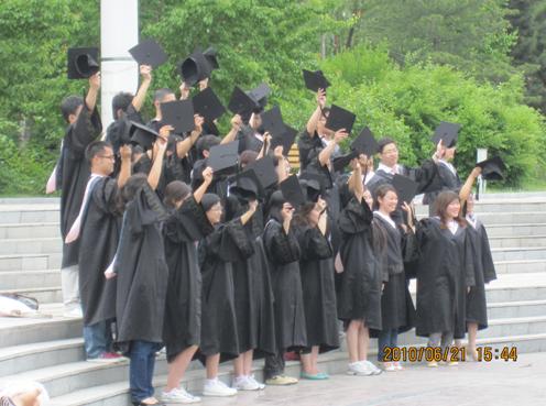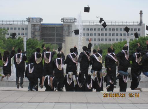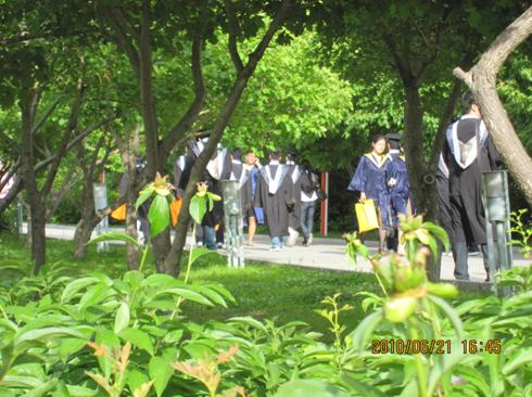 记者看到,某工科的全班学生聚在一起,数量不多的女同学像花心一样被男同学围在前边,毕业的同学感情,就像学校宿舍前常见的标语“we love you forever”。他们面对着五月花广场,面对着相机镜头,排好队形,摆好POSE,“1……2…… ”,摄影师连“3”还没来得及出口,同学们已经腾空而起,学位帽随着这样的起势在空中飞扬。一生一次的毕业的美丽刹那间定格,画面上留住了毕业年华潇洒的身姿和今生难舍的挂念。“……太多的回忆在学校发生,数也数不完就像妈妈脸上的皱纹,真想再来一次如果有这个可能,但我知道这将是我最后的青春……”(于姗姗)