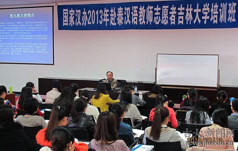 3月18日,原中国驻泰王国特命全权大使张九桓受邀到吉林大学国际汉语教师培训基地为国家汉办2013年赴泰国汉语教师志愿者学员授课。讲座以“走进泰国”为题,畅谈了中泰的历史渊源,外交政策以及泰国本土的历史、政治、文化、经济、风光等多个方面内容。