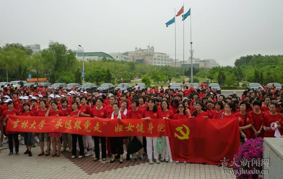 6月22日,随着校党委副书记蔡莉的一声号令:“我宣布吉林大学‘永远跟党走’妇女健身跑现在开始。”600多名身着红色运动衫的女教职工在旗手的带领下,围绕中心校区甬道开始了千余米的跑步。这是为庆祝建党90周年,校妇委会和教育工会联合组织的吉林大学“永远跟党走”妇女健身跑活动。