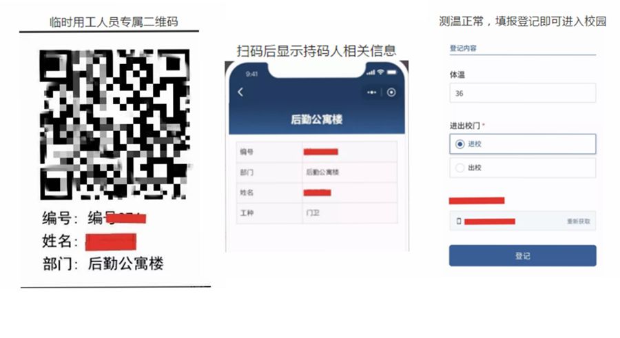 学校保卫处通过数据统计分析发现,每天固定进出校园的多为临时用工人员,且进出时间较为集中。为准确掌握进出校园人员信息,提高工作效率,保卫处启用二维码登记系统。该系统可根据各单位上报的临时用工人员信息生成个人专属二维码。进出校门人员只需出示相关证明和个人二维码,由保卫处工作人员扫码核对人员信息并录入体温后,系统即可自动记录该人员进出校门时间和体温等信息,避免了自行填报信息准确率和效率较低的问题。