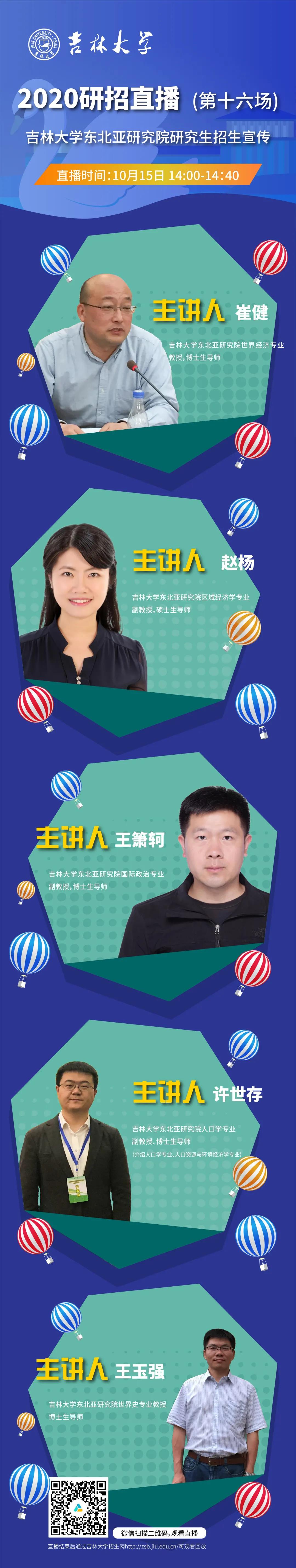 研招直播第十六场邀请到吉林大学东北亚研究院世界经济专业博士生导师崔健教授、区域经济学专业硕士生导师赵杨副教授、国际政治专业博士生导师王箫轲副教授、人口学专业博士生导师许世存副教授、世界史专业博士生导师王玉强教授带你一同走进东北亚研究院。