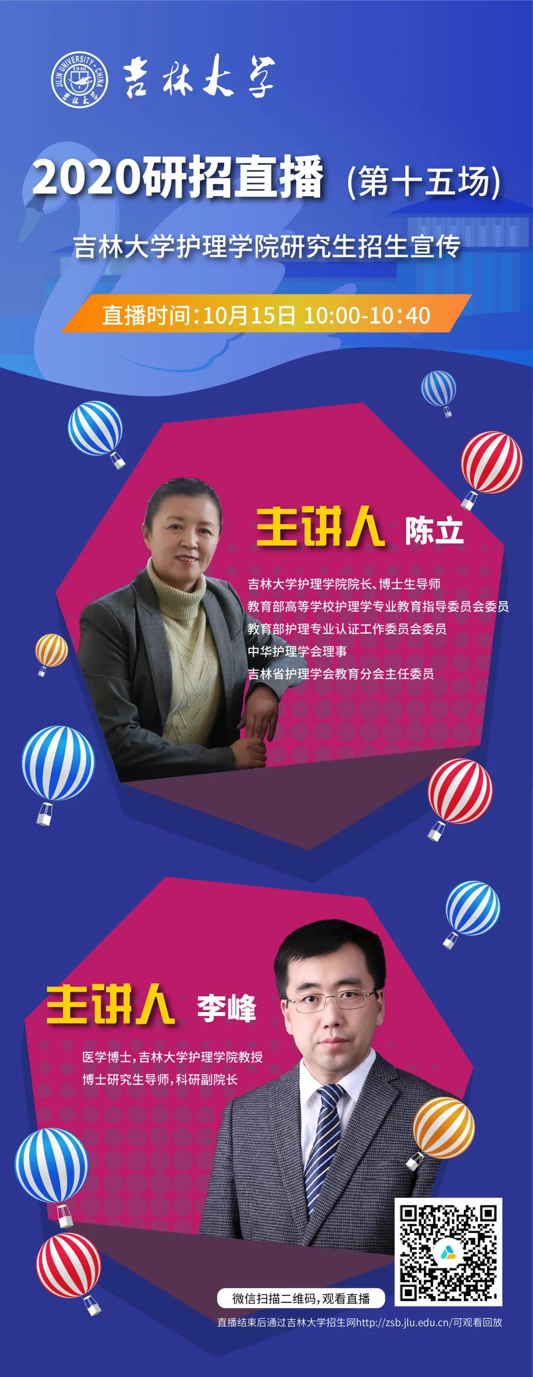 研招直播第十五场邀请到吉林大学护理学院院长、博士生导师陈立教授,吉林大学护理学院科研副院长、博士研究生导师李峰教授带你一同走进护理学院。