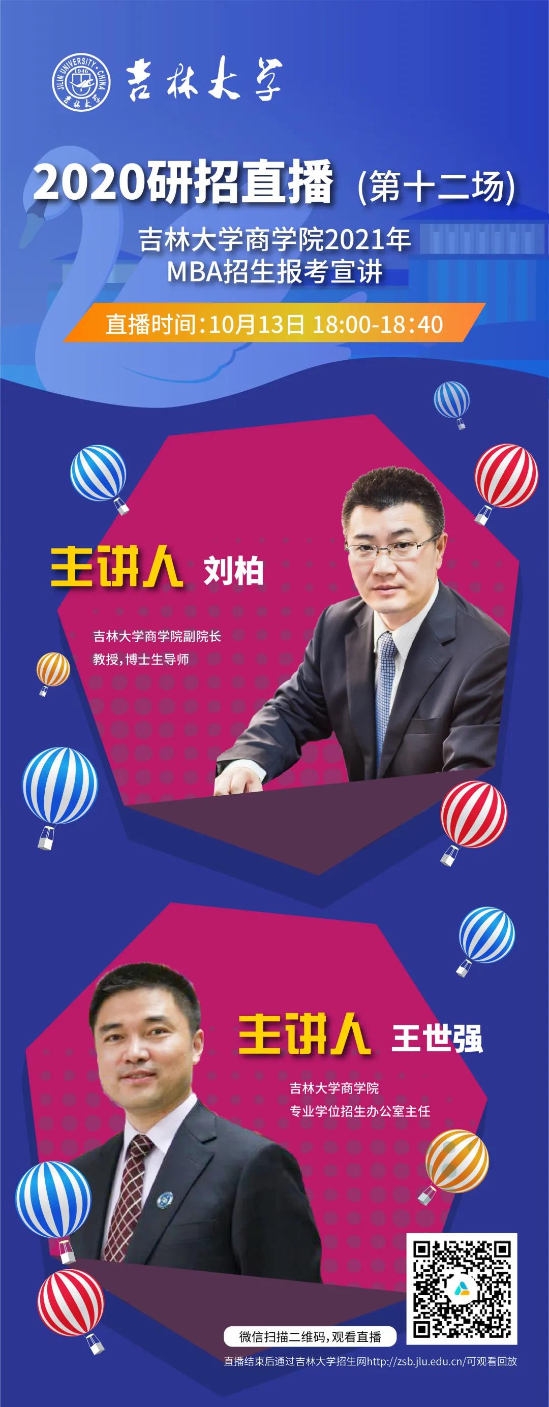 研招直播第十二场邀请到吉林大学商学院学院副院长、博士生导师刘柏教授,专业学位招生办公室王世强主任带你一同走进商学院。