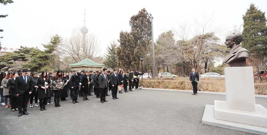 全体参加纪念活动的人员面对白求恩雕像默哀一分钟后,白求恩医学部学生代表田宏远和马思远两位同学朗诵了白求恩医学部撰写的纪念文章《英雄离世八十载,精神引领白衣人》。白求恩精神青年研究会学生代表刘昊鹏同学诵读了毛泽东主席撰写的《纪念白求恩》原文。参加纪念活动的全体人员向白求恩雕像敬献鲜花。