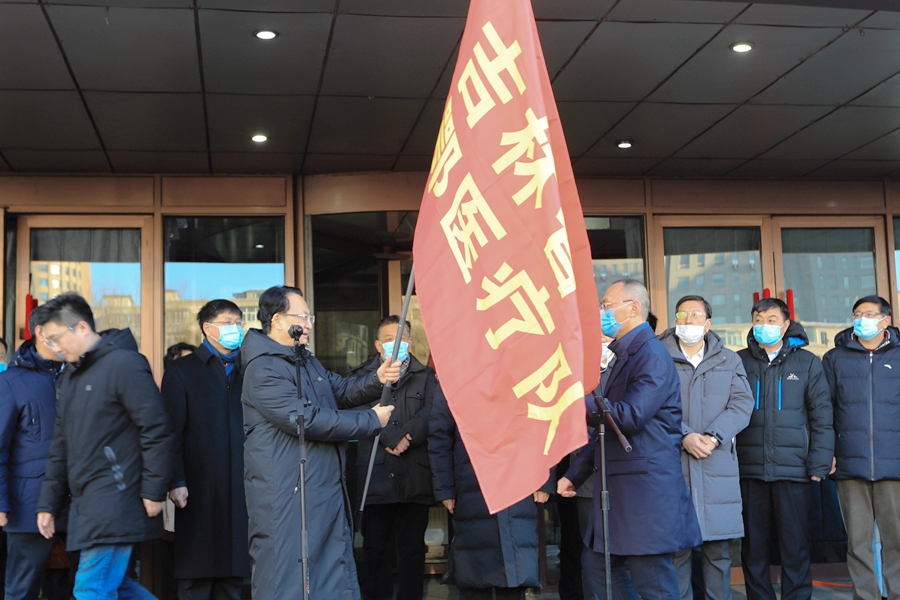 仪式上,景俊海向吉林省援助湖北省抗击新型冠状病毒感染肺炎医疗队授旗。