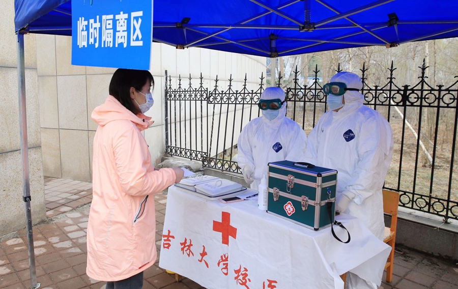 在南苑四公寓演练现场,分别设有研究生返校登记处和本科生返校登记处,返校学生需在此报到。登记时办理入住手续,每个同学将获得一个健康包、校园出入证和《返校学生须知》;当扫描“吉大码南苑四公寓”二维码后,进入等候区,进行足底消毒;在测温区,体温正常者进入宿舍,向管理人员出示本人学生证、出入证等;核验身份后,佩戴口罩方可进入寝室。如体温有异常者将被引到校医院的临时观察站,经校医院检查合格后,出示有关证明方可进入。中心校区制作的蓝底彩字的“温馨提示”板对进入宿舍前后都提出明确要求。