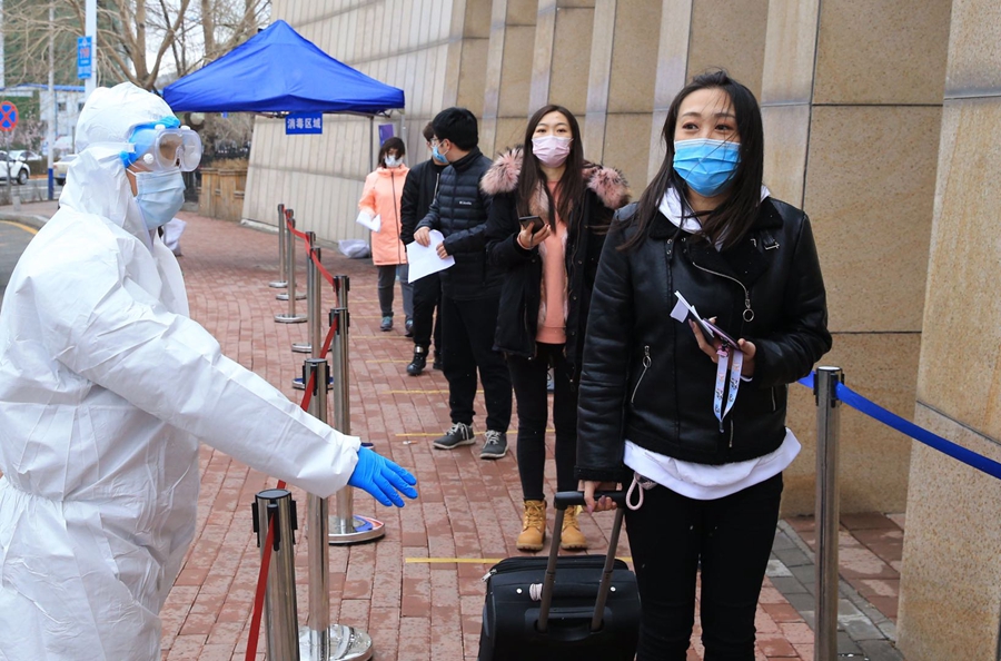 返校学生出站后沿吉林大学报到标识至报到区,排队间隔1米,佩戴口罩。经工作人员询问确认身份后进入体温检测和健康问询环节,体温正常,无不适症状。在本科生、研究生信息核验区,工作人员首先扫描学生吉祥码(应为绿色)、核验学校提前审批的返校证明(确定学生为该批次返校学生),最后核验学生证(确认为学生本人),上述“一码两证”通过核验后,工作人员登记并为学生按校区车次发放乘车座位号。随后返校学生按指引到乘车区行李消毒点,工作人员为学生行李消毒,学生安置行李,进行手消毒,顺序乘车,对号入座,间隔就座。测温、扫码、核验、消毒,四个环节保证健康学生安全返校。