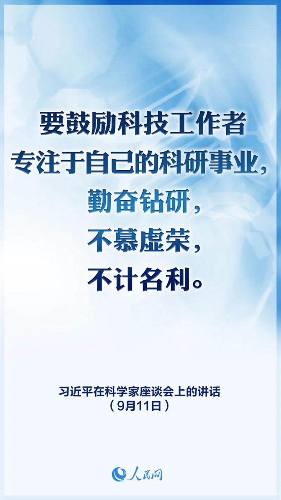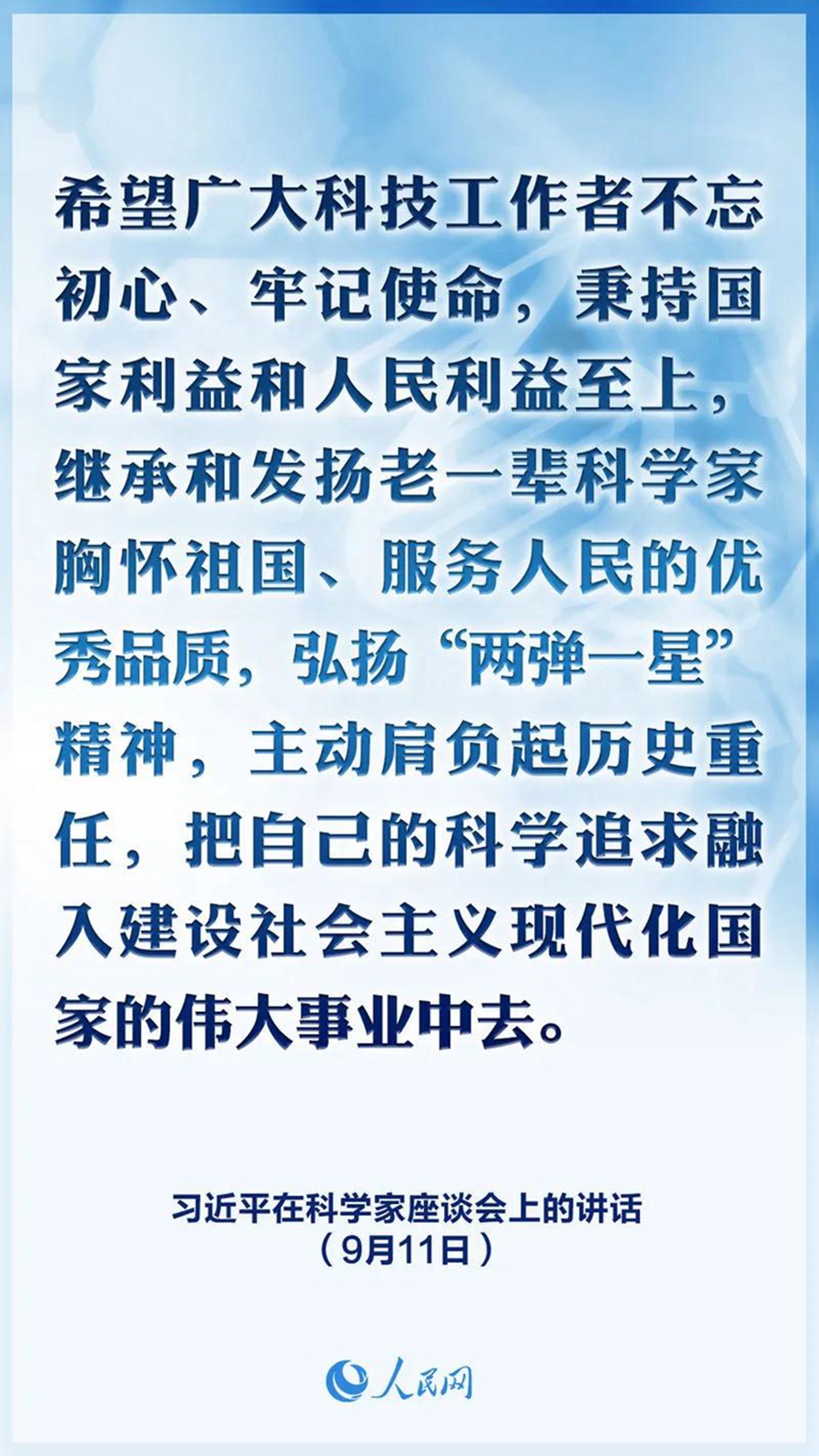 科学无国界,科学家有祖国。我国科技事业取得的历史性成就,是一代又一代矢志报国的科学家前赴后继、接续奋斗的结果。从李四光、钱学森、钱三强、邓稼先等一大批老一辈科学家,到陈景润、黄大年、南仁东等一大批新中国成立后成长起来的杰出科学家,都是爱国科学家的典范。希望广大科技工作者不忘初心、牢记使命,秉持国家利益和人民利益至上,继承和发扬老一辈科学家胸怀祖国、服务人民的优秀品质,弘扬“两弹一星”精神,主动肩负起历史重任,把自己的科学追求融入建设社会主义现代化国家的伟大事业中去。