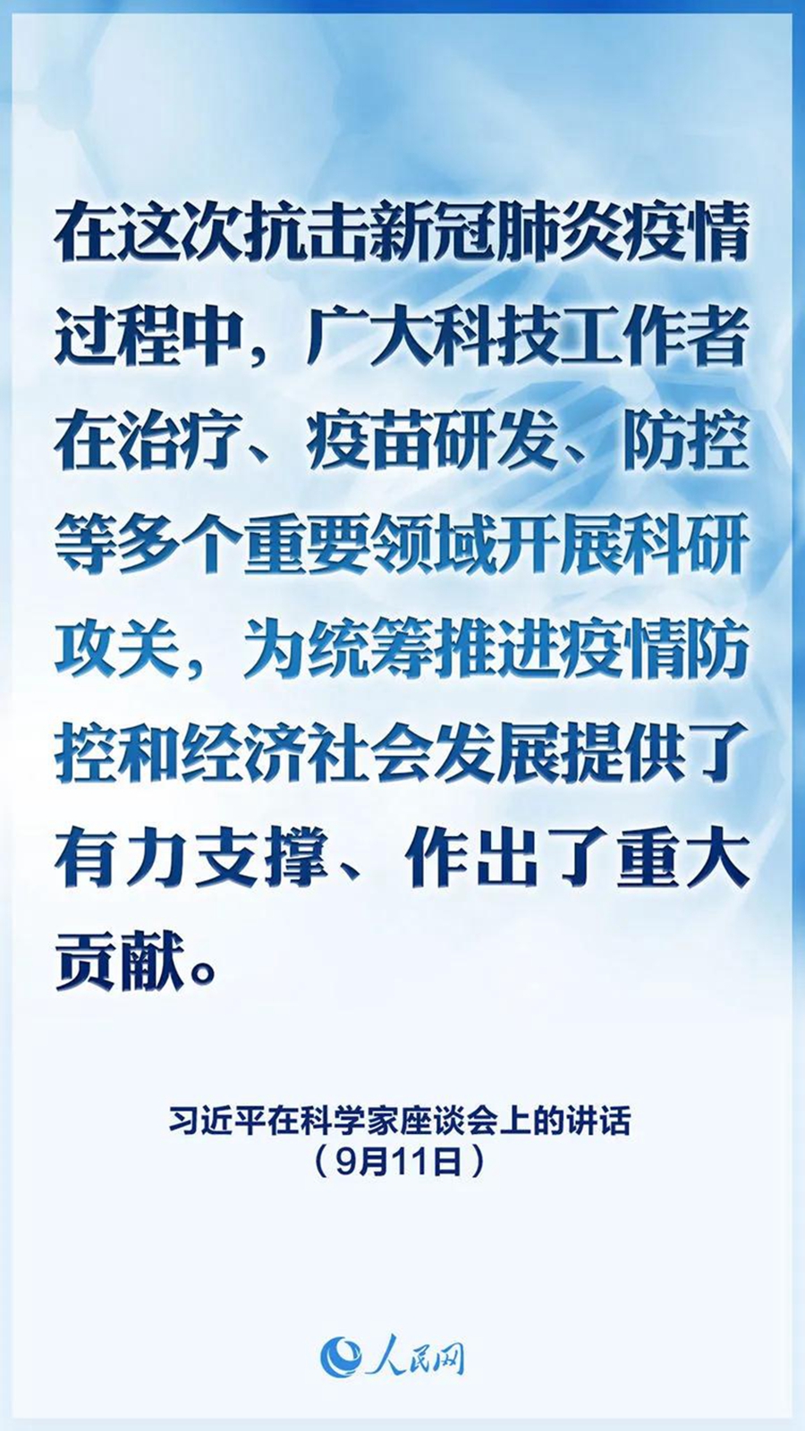党的十八大以来,我们高度重视科技创新工作,坚持把创新作为引领发展的第一动力。通过全社会共同努力,我国科技事业取得历史性成就、发生历史性变革。重大创新成果竞相涌现,一些前沿领域开始进入并跑、领跑阶段,科技实力正在从量的积累迈向质的飞跃,从点的突破迈向系统能力提升。在这次抗击新冠肺炎疫情过程中,广大科技工作者在治疗、疫苗研发、防控等多个重要领域开展科研攻关,为统筹推进疫情防控和经济社会发展提供了有力支撑、作出了重大贡献。借此机会,我向广大科技工作者表示衷心的感谢!