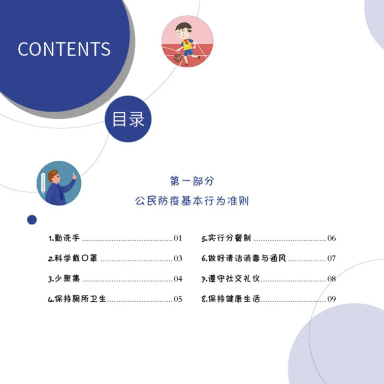 第一部分为公民防疫基本行为准则,包括勤洗手、戴口罩、少聚集、分餐制、社交礼仪以及厕所卫生、通风与消毒、健康生活等八方面;