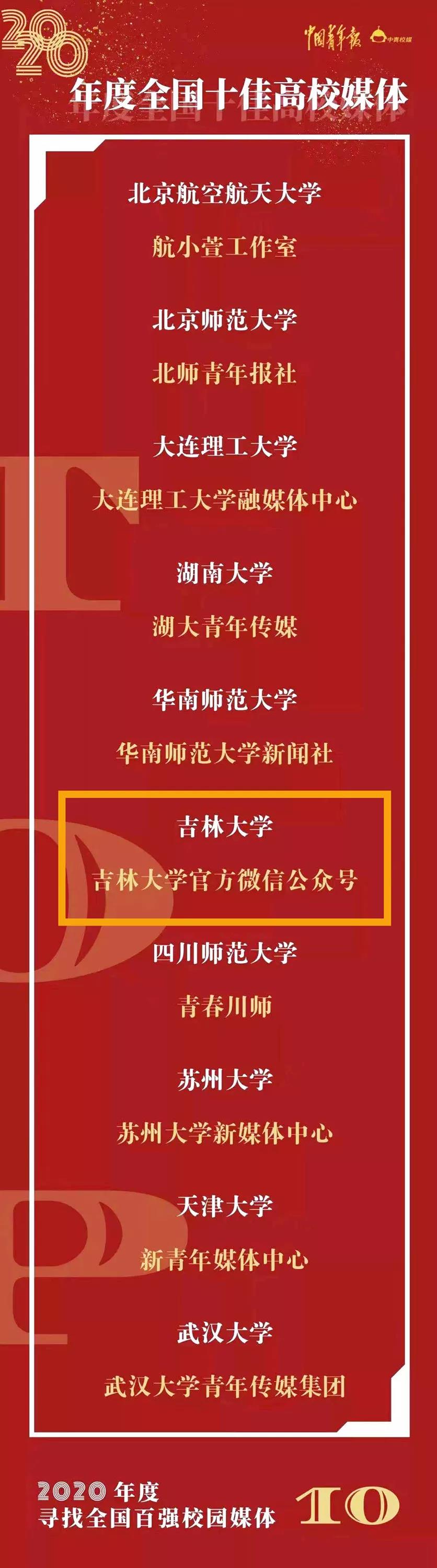近日,吉林大学官方微信公众号在由中国青年报社、中国青少年新媒体协会、中青校媒联合举办的2020年“高校新闻扶持计划”寻找全国百强校园媒体活动中获得“2020年度全国十佳高校媒体”称号。