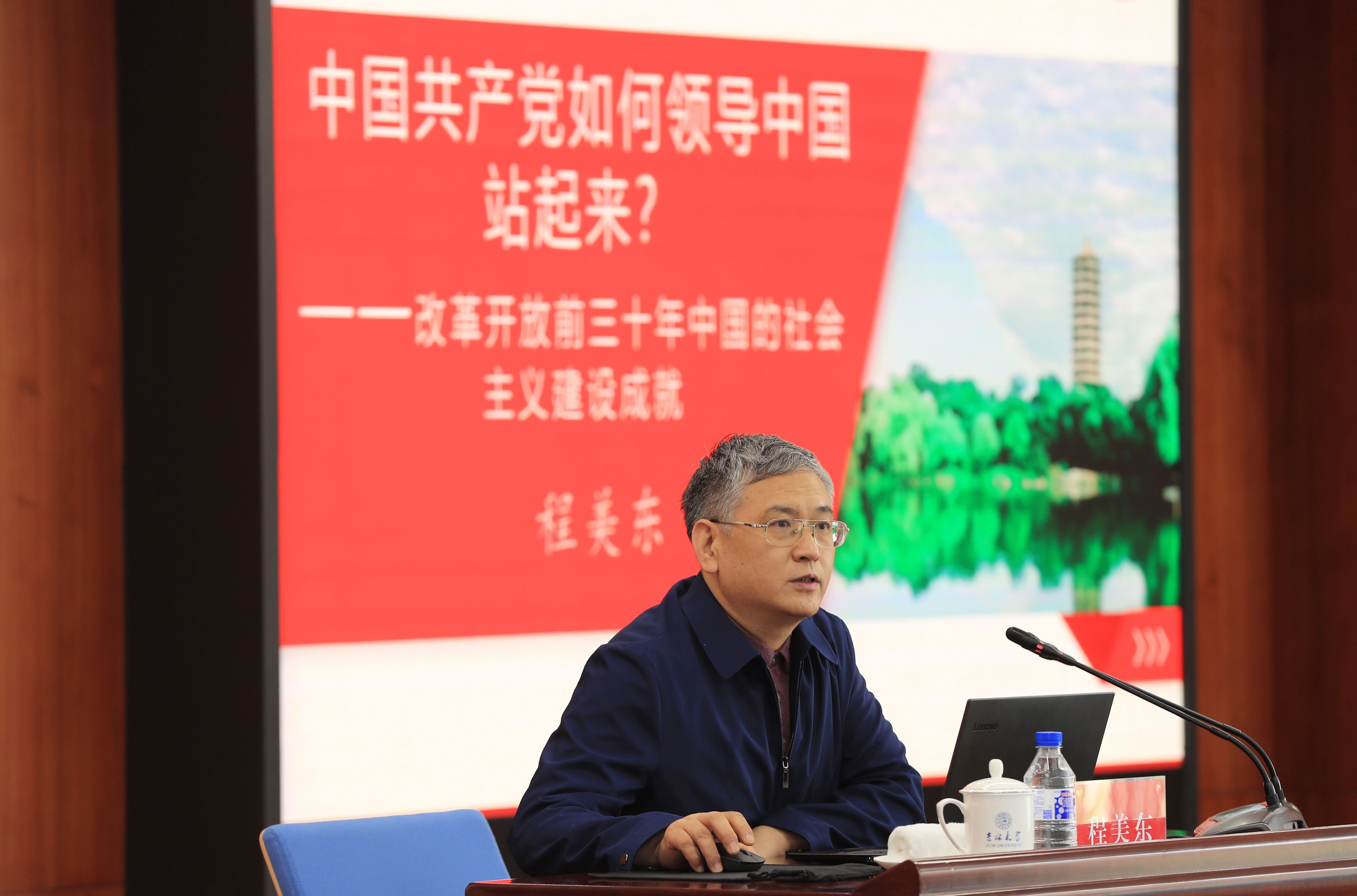会上,北京高校中国化马克思主义教学研究会会长、教育部思政课教学指导委员会委员、北京市哲学社会科学中国化马克思主义发展研究基地负责人兼首席专家、北京大学中共党史研究中心常务副主任、北京市社科联常委、北京大学马克思主义学院程美东教授作了题为《中国共产党如何领导中国站起来?——改革开放前三十年中国的社会主义建设成就》的讲座。他结合个人多年教学、科研和实践经验,围绕民族、国家、独立是现代化国家建立的基础,我国改革开放前三十年社会主义建设的成就,实现中国站起来的举措,国家发展的不利因素,建设社会主义的路径选择五个方面进行了系统的理论阐述和实践分析。他以纪实性的回顾总结、探讨性的研究成果,从一定角度和侧面展示了改革开放前三十年我国经济社会发展的面貌和改革开放前三十年的历史进程,准确回答好了中国共产党如何领导中国站起来这一问题。